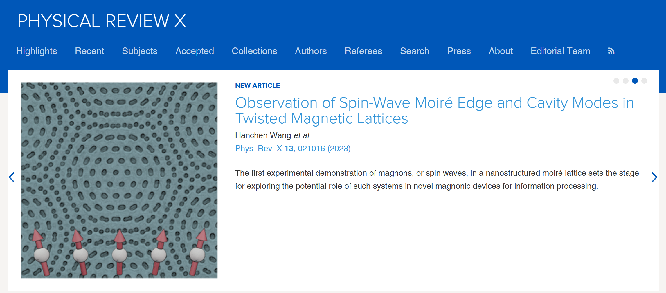 H. Wang, M. Madami*, J. Chen, H. Jia, Y. Zhang, R. Yuan, Y. Wang, W. He, L. Sheng, Y.-L. Zhang, J. Wang, S. Liu, K. Shen, G. Yu, X. Han, D. Yu, J.-Ph. Ansermet*, G. Gubbiotti* and H. Yu*, Observation of spin-wave moiré edge and cavity modes in twisted magnetic lattices.Phys. Rev. X13, 021016 (2023).