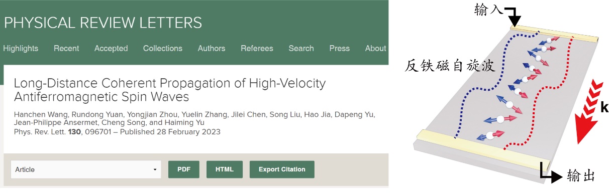 H. Wang, R. Yuan, Y. Zhou, Y. Zhang, J. Chen, S. Liu, H. Jia, D. Yu, J.-Ph. Ansermet*, C. Song* and H. Yu*, Long-distance coherent propagation of high-velocity antiferromagnetic spin waves.Phys. Rev. Lett.130, 096701 (2023).