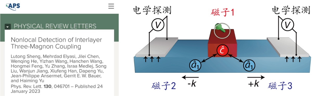 1)2023年1月发表在Physical Review Letters的“Nonlocal Detection of Interlayer Three-Magnon Coupling”(层间三磁子耦合的非局域探测)工作利用自旋波(磁子)的非线性效应将一个磁子(磁子1)分裂成具有一半能量和相反动量的两个磁子(磁子2和磁子3),这一过程被称作三磁子效应,通常发生在同一材料体系中。北航集成电路学院于海明课题组与合作者利用逆自旋霍尔效应对劈裂出的两个磁子进行非局域的电学探测,首次观测到两种不同材料体系中的层间三磁子耦合,为进一步研究基于磁子的量子纠缠效应提供了重要的实验基础。
