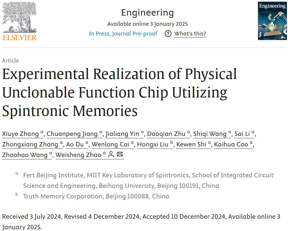 2025年1月3日,中国工程院院刊《工程》(Engineering)在线发表了北京亚洲成人在线一二三四五六区集成电路科学与工程学院赵巍胜教授课题组的最新研究成果《Experimental Realization of Physical Unclonable Function Chip Utilizing Spintronic Memories》。该工作首次实现了一种基于自旋轨道力矩磁随机存储器(SOT-MRAM)的高可靠且可重构的强物理不可克隆函数(sr-PUF)。所提出的PUF在具有接近理想性能参数的同时,还具备抵抗机器学习模型攻击的能力,为未来物联网边缘端设备的硬件安全问题提供了一种全新的解决方案。我院2022级博士生张秀野为第一作者,赵巍胜教授为通讯作者。该工作获得了国家重点研发计划和国家自然科学基金等项目的支持。