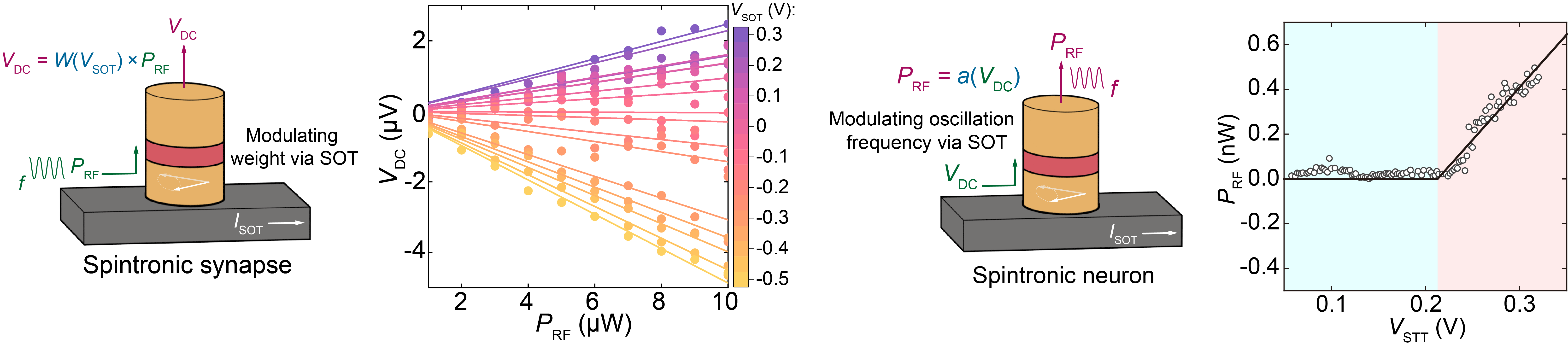 对于突触器件,以射频信号功率作为输入,MTJ产生的自旋整流电压作为输出,可实现神经网络中的乘累加运算。研究团队创新性地使用自旋轨道矩(SOT)电流通过纯电学方式调控权重大小,与传统通过磁场线中奥斯特场的方式相比功耗可降低约21.27倍,并且更容易进行尺寸微缩。对于神经元器件,以直流驱动电压作为输入,MTJ产生的振荡信号功率作为输出,可近似实现神经网络中的激活函数。相应地,输出振荡信号的频率也可通过SOT电流进行纯电学调控,以便与突触器件进行多层级联。