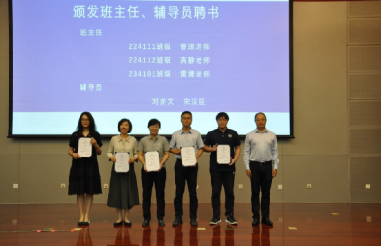 常务副院长张悦为学院新生班主任高静、曾琅、雷娜老师以及研究生辅导员刘亦文、本科生辅导员宋汉臣颁发聘书。