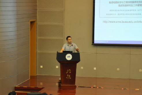 集成电路学院常务副院长张悦在致辞中对同学们的到来表示了诚挚的欢迎,并向新生介绍了学院的发展历程及整体情况。他向新生们提出了四点建议:一是要学会追求,设立远大目标并为之奋斗;二是要学会坚持,不松懈、不倦怠,全情投入到科研、学习生活中;三是学会沟通,多与老师、同学等进行交流;四是要学会拼搏,保持年轻人的朝气,时刻怀有充沛的上进心,祝愿本研新生在科研、学习中都能做出满意的成果,做学院的创“史”人,抓住时代机遇,勇立时代潮头。