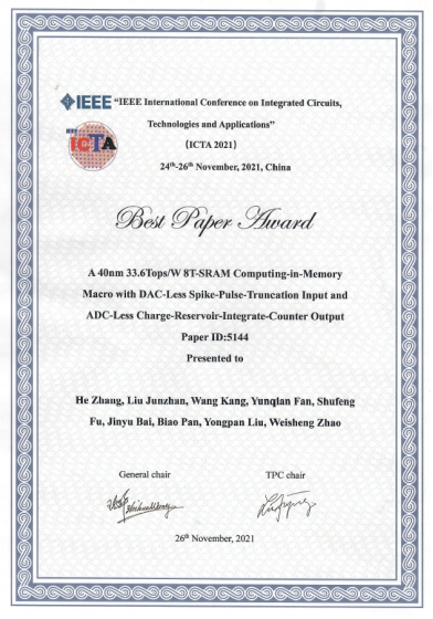 2021年11月24-26日,IEEEICTA(International Conference on Integrated Circuits, Technologies and Applications)在珠海召开。在本次会议上,北航集成电路学院存算一体芯片团队发表了题为“A 40nm 33.6Tops/W 8T-SRAM Computing-in-Memory Macro withDAC-less Spike-Pulse-TruncationInput and ADC-less Charge-Reservoir-Integrate-Counter Output”的研究成果,并荣获Best Paper Award奖项。我院博士后张和为该论文第一作者,北京亚洲成人在线一二三四五六区为第一单位,康旺副教授为论文第一通讯作者。该工作获得了北京市科技新星项目和北京市自然科学基金的支持。
