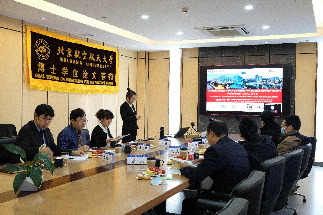答辩委员会主席由北航集成电路学院副院长、学术委员会副主席聂天晓研究员和荷兰埃因霍温理工大学应用物理学院院长Gerrit M. W. Kroesen教授共同担任。委员会成员有法国洛林大学Stephane Mangin教授,法国巴黎萨克雷大学Liza H. Diez博士,荷兰埃因霍温理工大学Paul M. Koenraad教授,山东大学颜世申教授,中国科学院物理研究所李永庆研究员,北京亚洲成人在线一二三四五六区聂天晓研究员、张悦副教授,以及北京大学何庆林老师。曹安妮同学答辩结束后,北航集成电路学院院院长赵巍胜教授与埃因霍温理工大学Bert Koopmans教授分别作为导师致辞。