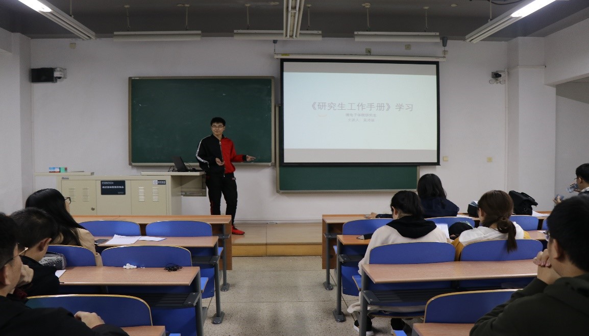 同学们还认真学习了《研究生工作手册》,细致了解了研究生阶段与本科生阶段的培养差异以及相关的管理规定、学位要求和“奖贷助免”方面的情况。