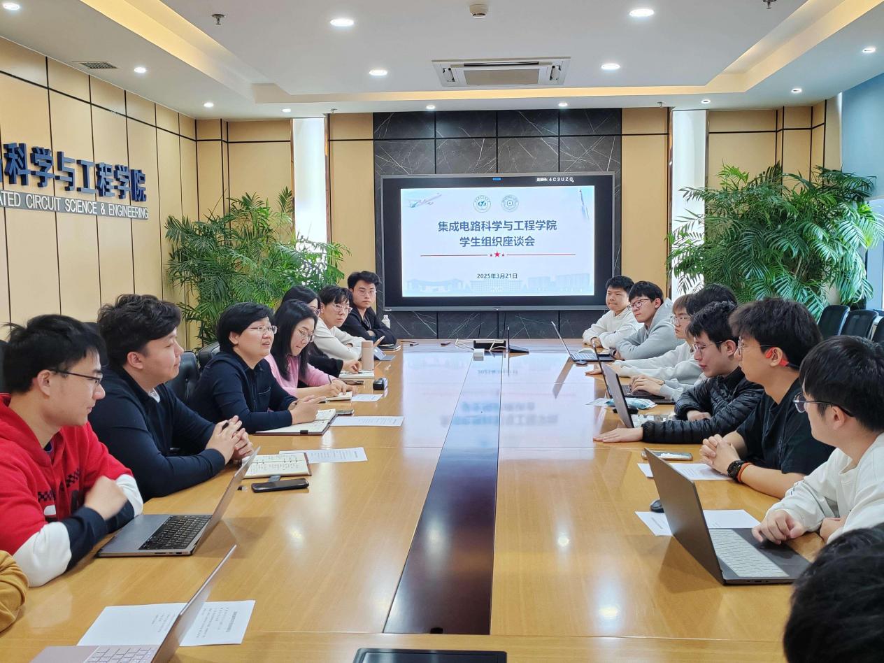 为加强学生组织间联动协作,凝聚青春力量,共同助力服务同学成长与学院文化建设,集成电路科学与工程学院于3月21日召开学生组织座谈会,学院党委书记高静、专职辅导员丁瑞云、胡晏铭、邓修齐与分团委、学生会、研究生会、新闻中心学生学生代表共同参与交流,座谈会由专职辅导员丁瑞云主持。