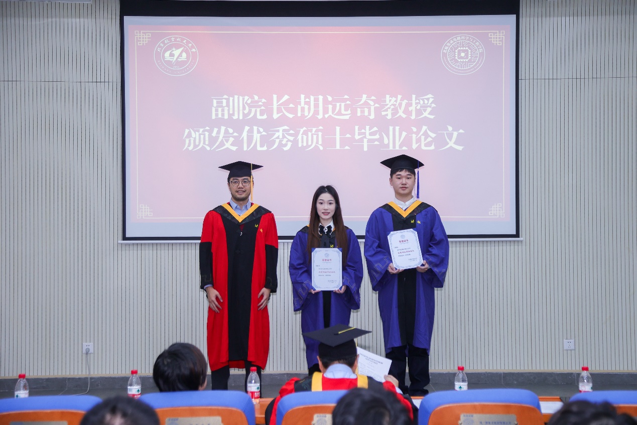 副院长胡远奇教授为优秀硕士毕业论文获奖同学颁发证书。