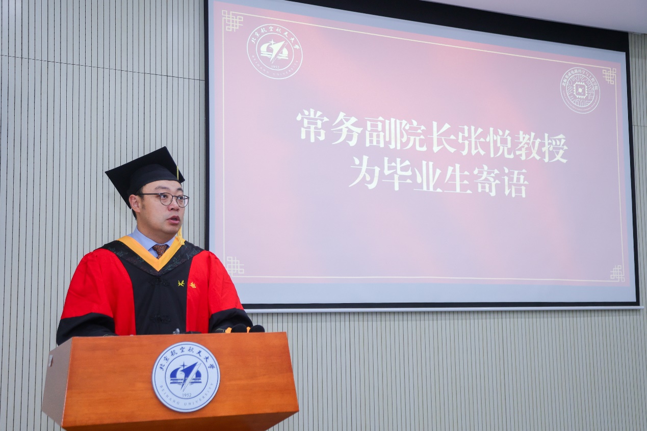 在热烈的掌声中,常务副院长张悦为毕业生寄语。他向5位博士毕业生和37位硕士毕业生致以祝贺,并向辛勤培育他们的老师和关心支持的家人致以衷心的感谢。他回顾了本届毕业生在研究生生涯中展现的青春风采,在学院发展建设中付出的巨大努力,见证了学院的飞速发展和多个历史性突破。