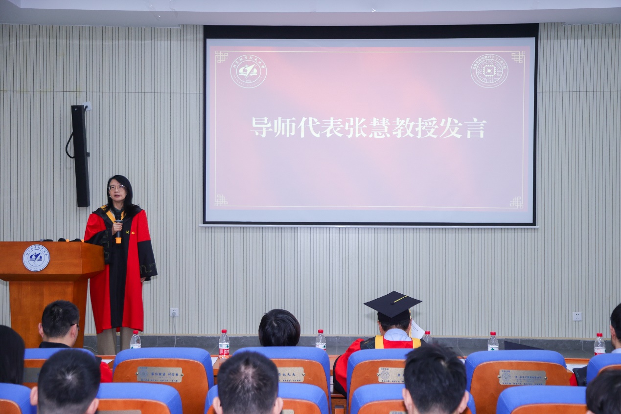 导师代表张慧教授对同学们顺利毕业致以热烈的祝贺!她见证了大家在学习期间积极参与课题研究、在各个领域取得卓越成果的奋斗历程,并希望在当前国家集成电路行业面临诸多关键问题的关键阶段,毕业生们能够牢记校训,“在工作中保持严谨的治学态度”“勇于创新,敢于突破传统思维的束缚”“心怀家国,将个人的发展与国家的需求紧密相连”“要有团队合作意识”,为实现我国集成电路产业的独立自主、安全可控贡献自己的力量。