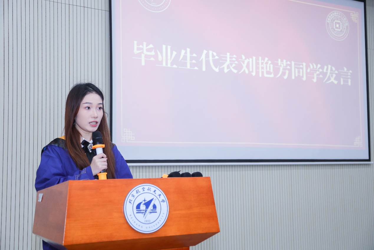 毕业生代表刘艳芳同学代表全体毕业生向父母、母校、老师们表达了感恩之情。她回顾自己在学院求学的两年半时光,在一次次的经历中浅尝“轻舟已过万重山”的欣喜;在不确定的处境中不断探索实践,磨砺自身、坚定信念;期盼着发挥所学,将理论付诸实现,为“中国芯”贡献自己的绵薄之力,展现新时代青年的成长与担当。