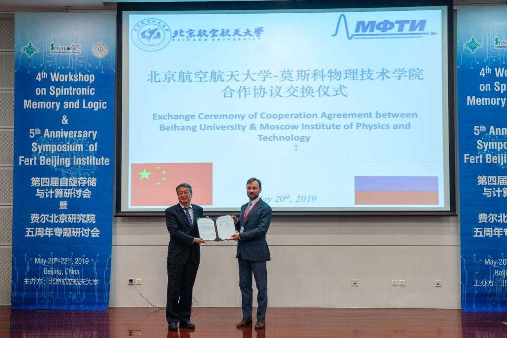 本次研讨会上,北航还与莫斯科物理技术学院(Moscow Institute of Physics and Technology,MIPT)达成了合作意向,黄海军副校长与莫斯科物理技术学院的Konstantin Zvezdin教授共同交换了合作协议。